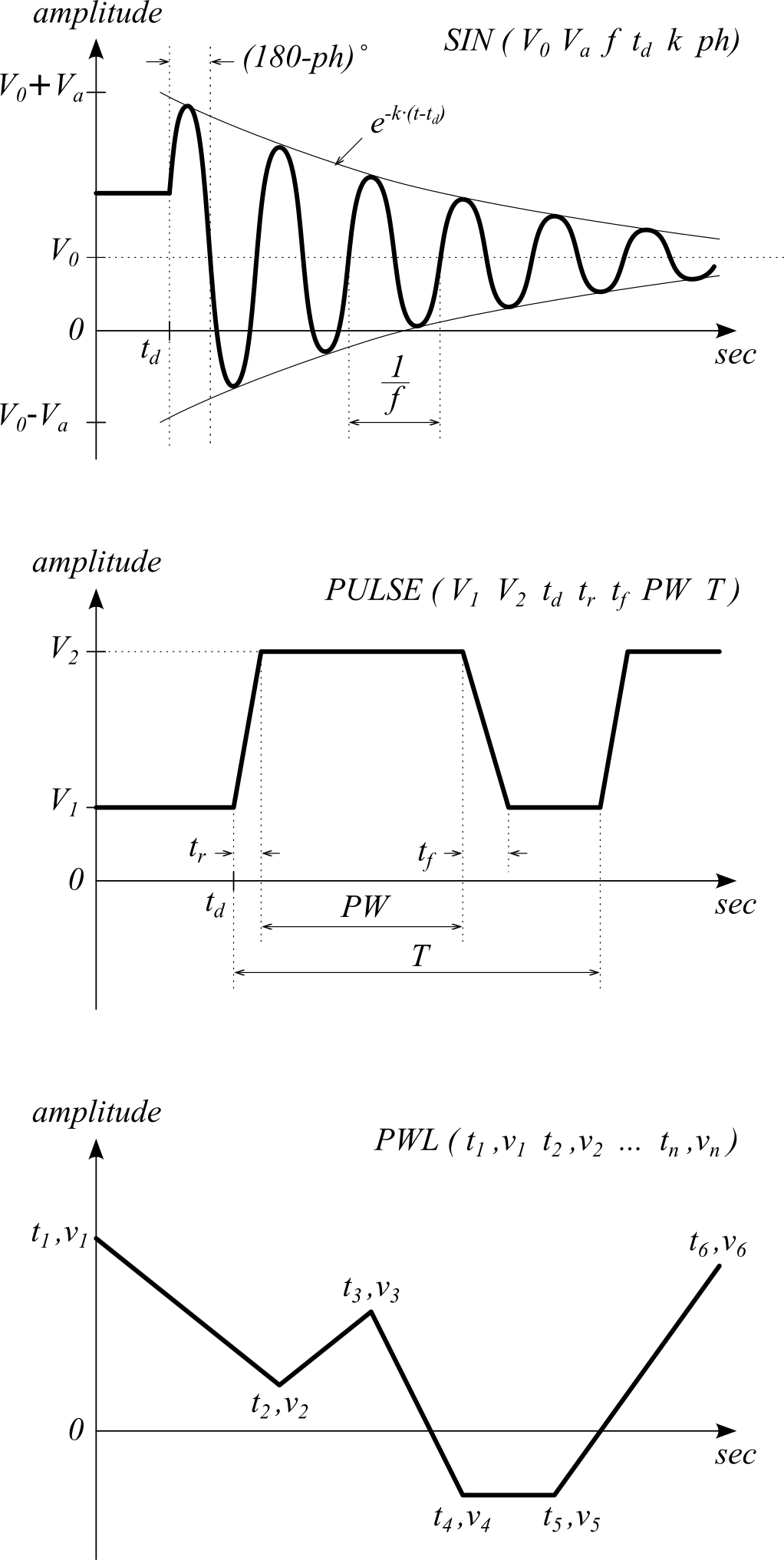 voltage source line above, three types of sources are defined—each for a different kind of analysis:
