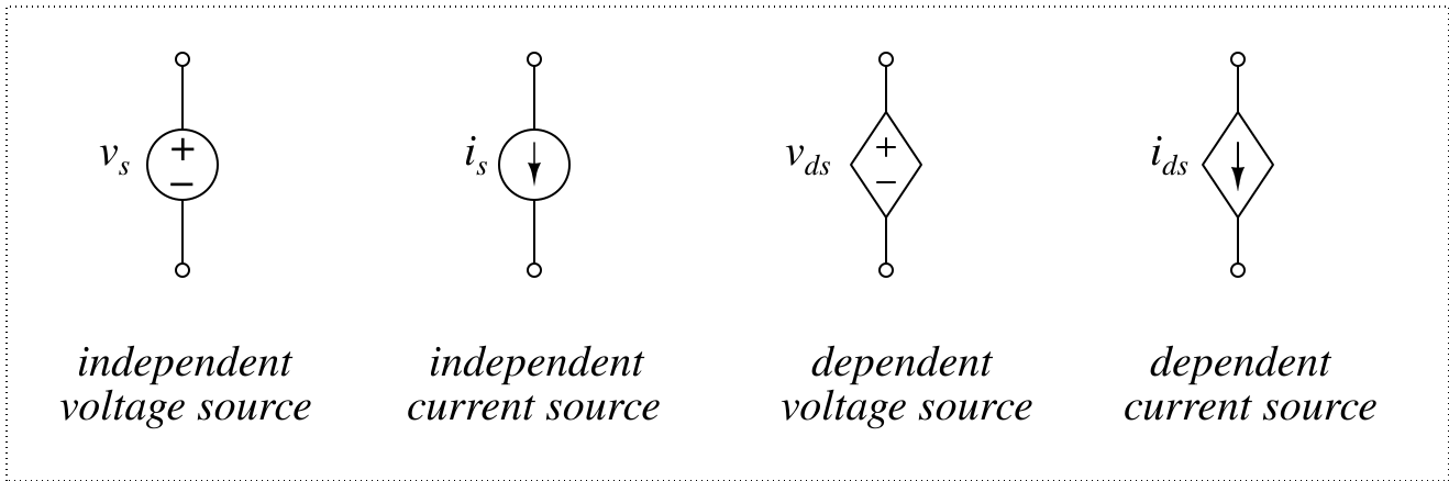 Active elements—such as transistors and diodes—are circuit elements that actively control the current or voltage in a circuit. These active elements can be modeled using ideal passive elements and power sources. Note that a model of an active element always includes at least one power source.